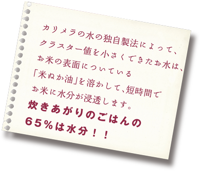 独自製法によって、クラスター値を小さくすることができたカリメラの水は、お米の表面についている「米ぬか油」を溶かして、短時間でお米に水分が浸透します。